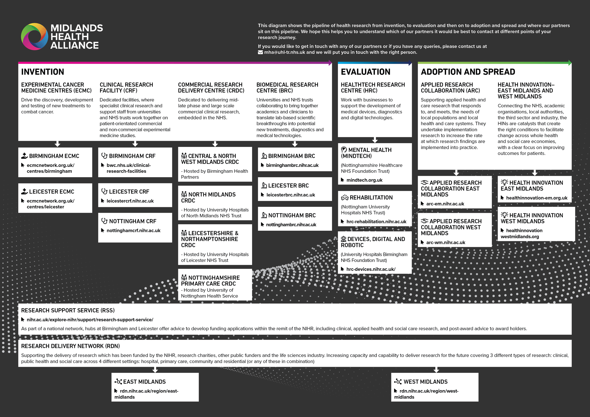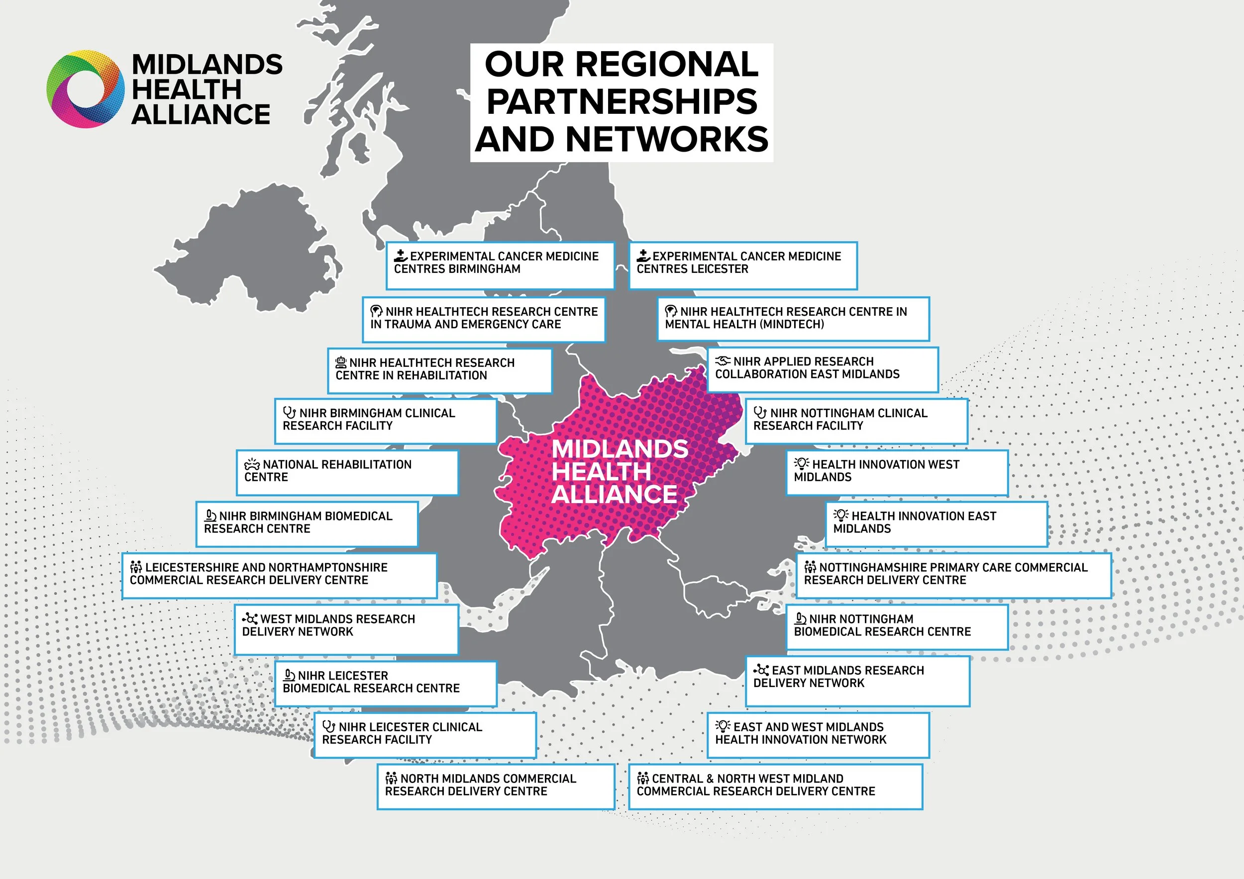 The Midlands Health Alliance (MHA) is a cluster organisation representing the National Institute for Health and Care Research (NIHR) infrastructure across the East and West Midlands, covering the whole research pipeline including early phase clinical trials through to applied health research.